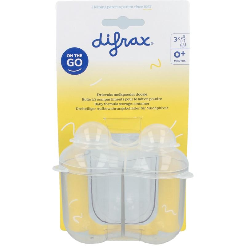 In het Difrax drievaks melkpoeder doosje kun je drie flesvoedingen hygiënisch meenemen, zoals melkpoeder of babyvoeding.